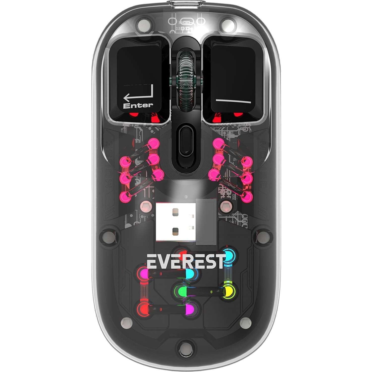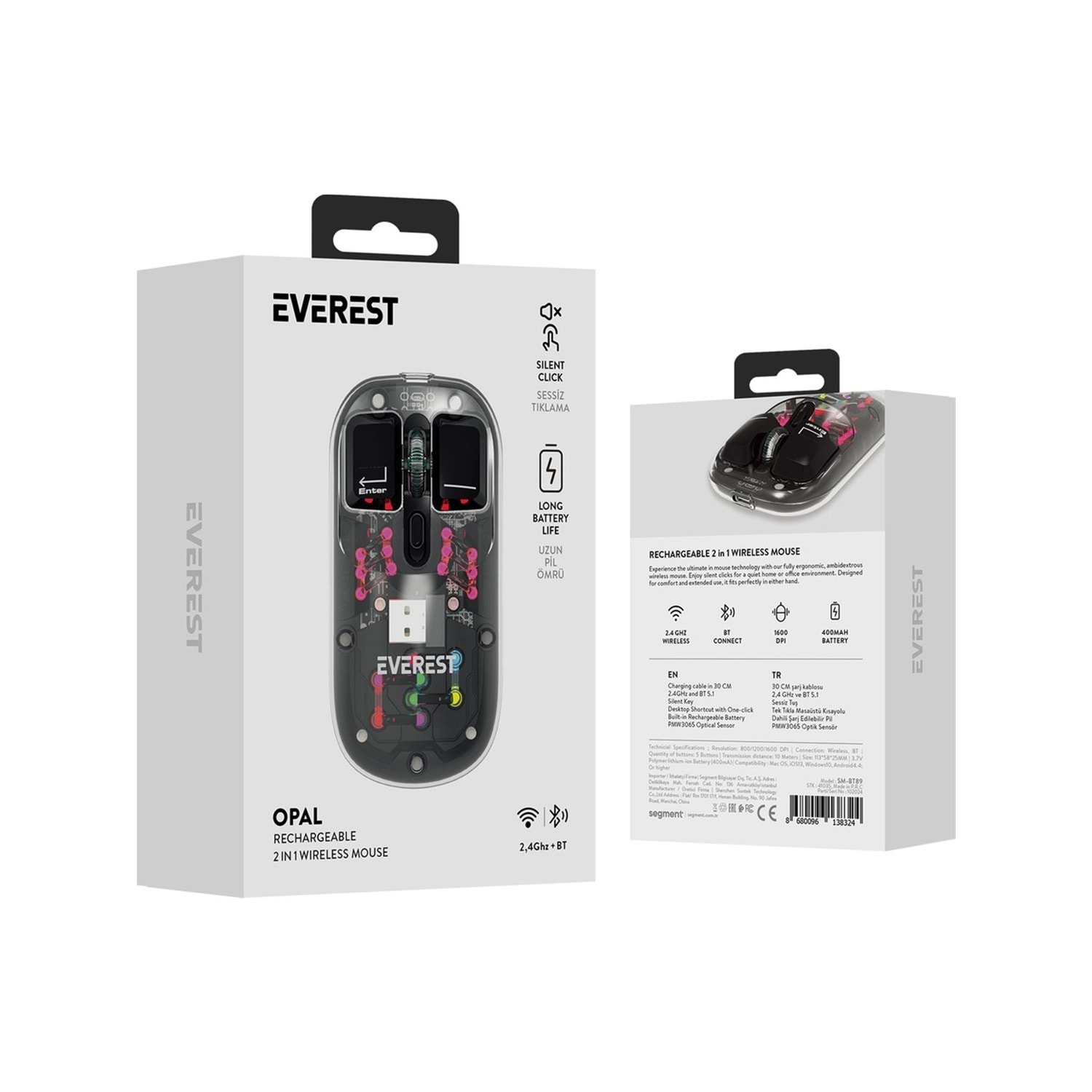 Everest SM-BT89 Opal Şarj Edilebilir Sessiz Siyah Transparan Rgb 2in1 2bt ve 2.4ghz Kablosuz Mouse